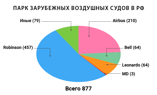 Из иностранных вертолетов наиболее популярны в России Robinson, которые составляют более половины парка вертолетов зарубежных производителей. Их общее количество в России — 457 машин, что на три больше, чем в 2017 году (454 вертолета).