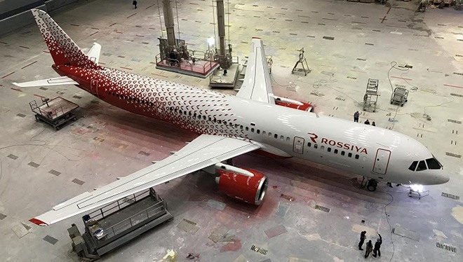 Фирменную раскраску "России" борт получил в Ульяновске, на предприятии "Спектр-Авиа", где, как отмечено, он окрашивался "с использованием краски российского производства".